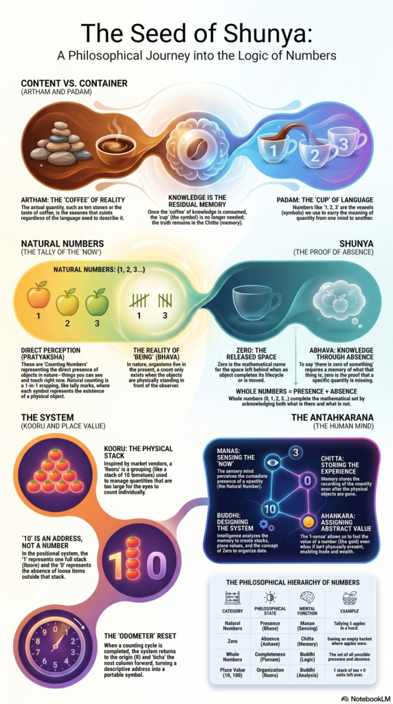 Reality is not a linear progression; it is a circular oscillation. The Zero (0) is not an absence of things, but the Dormant Static Potential of everything. In the Vedic tradition, this is the Poornam—the infinite fullness that remains infinite even when the universe is subtracted from it.